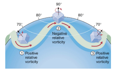 At (1), But as the air column moves south, decreases which causes the air column to spin faster than the surrounding air which produces cyclonic curvature . Vice versa at (2).